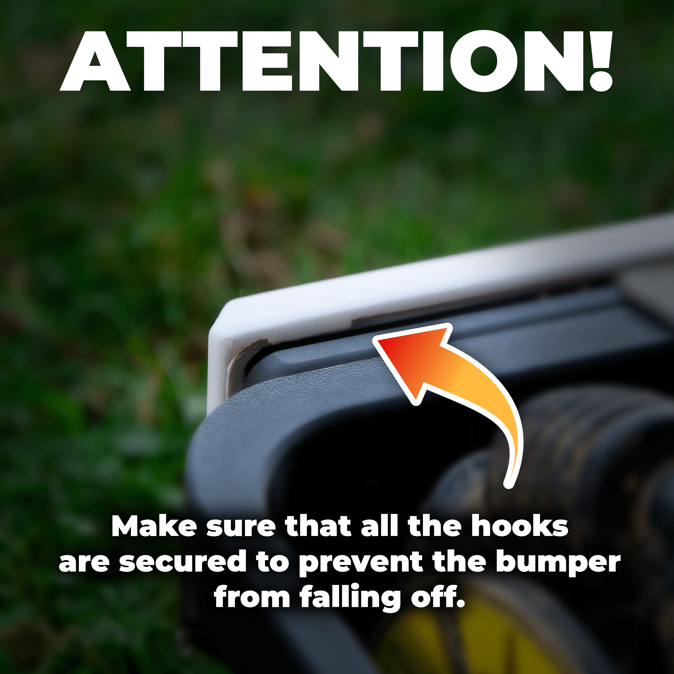 Die Installation ist schnell und unkompliziert – einfach den Stoßfänger auf den vorhandenen Bereich aufsetzen, bis er einrastet. (Videoanleitung verfügbar im Bereich „Anleitungen“ auf unserer Website.)