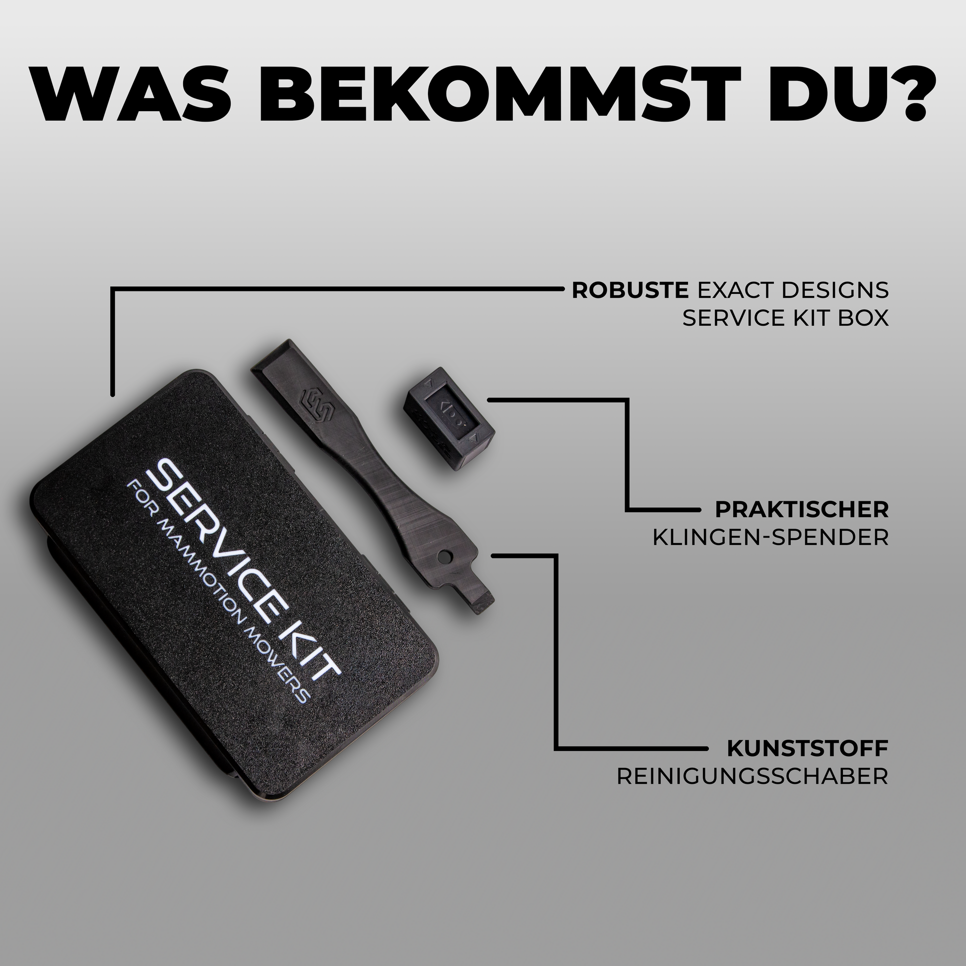 Das Paket beinhaltet eine Service-Kit-Box, einen robusten Spatel und einen Klingenzuführer.